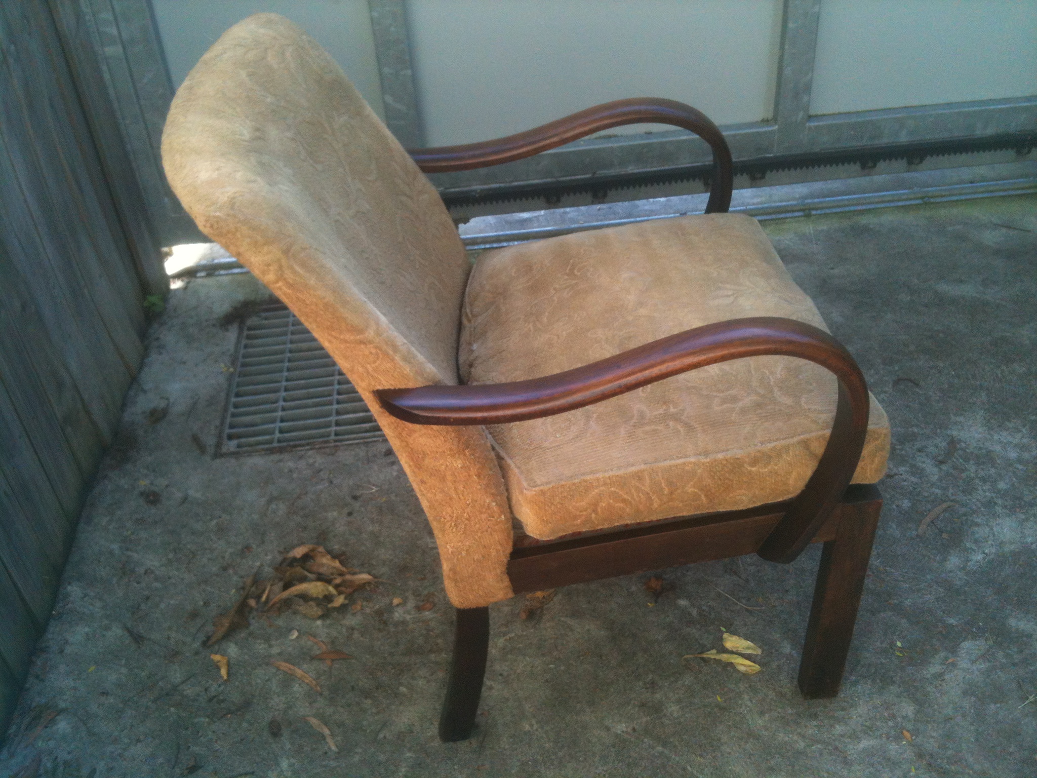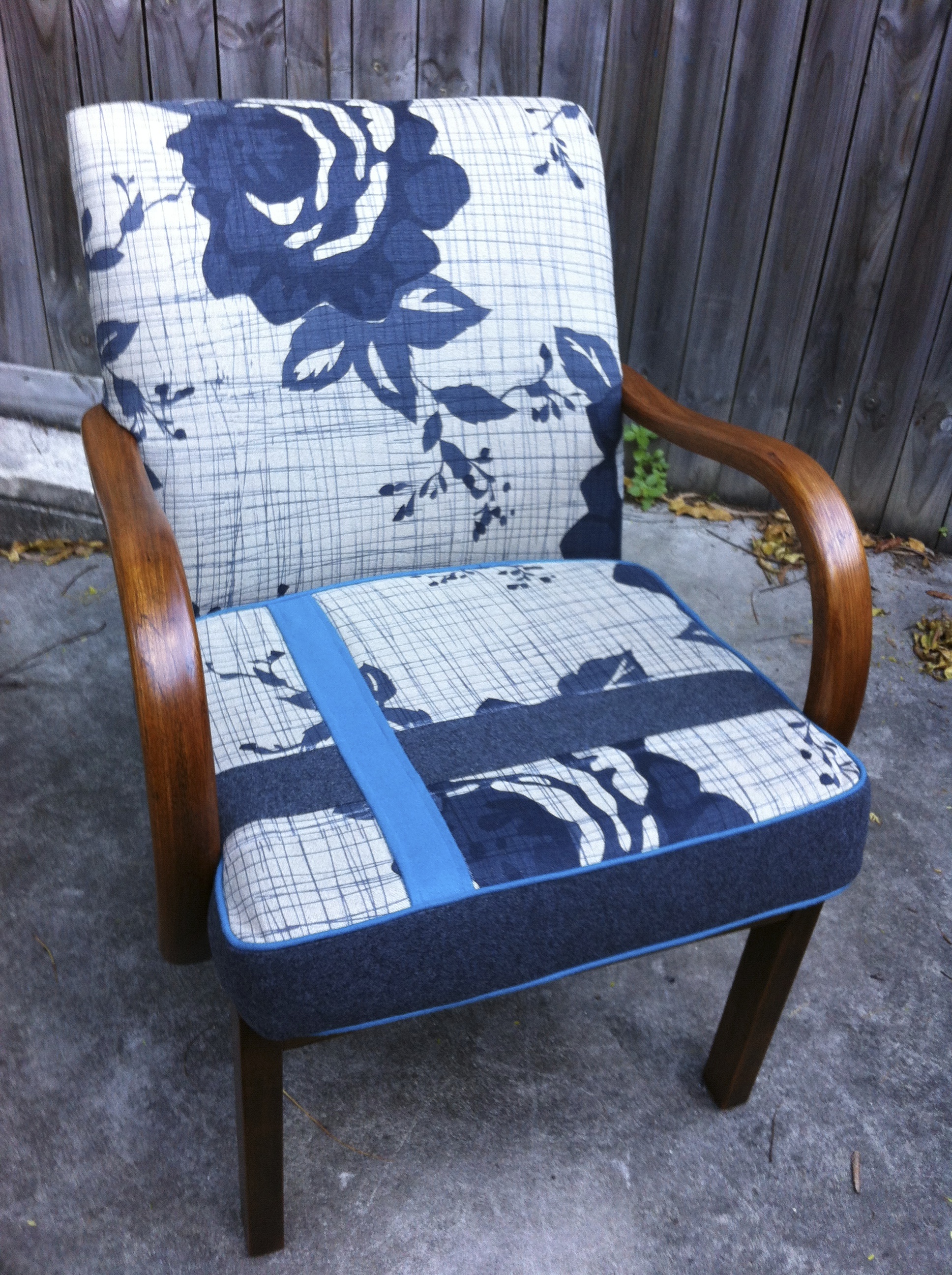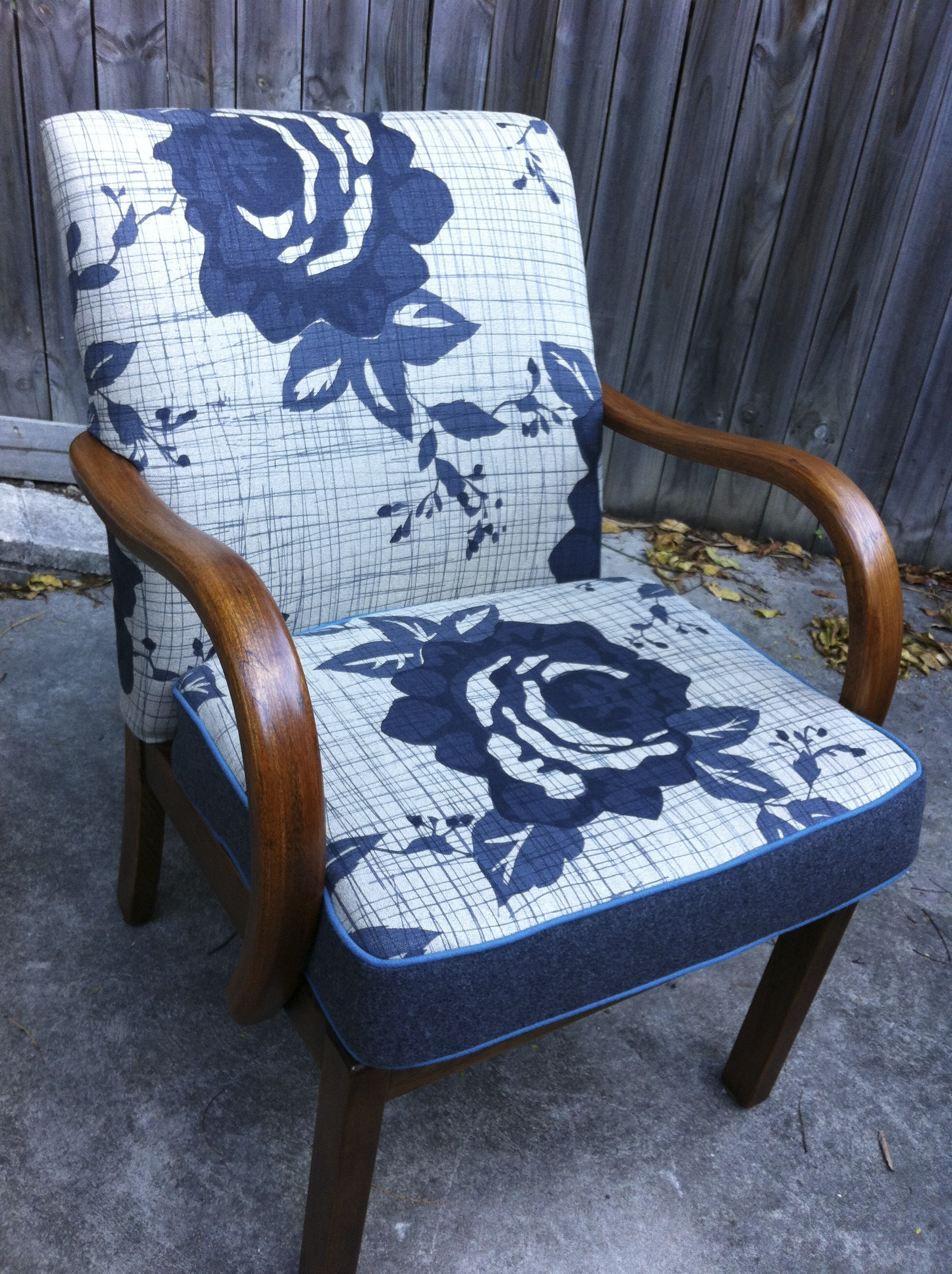 A friends daughter purchased an old bedroom chair at auction. She managed to look past the old dated fabric to a chair that would look fab updated in an interesting fabric.