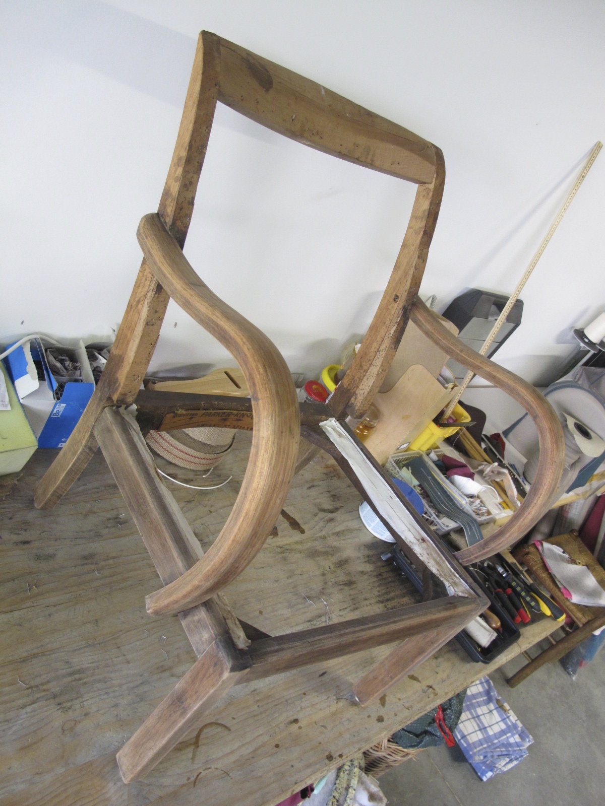 All the old coverings were taken off and chair stripped of the old wood finishing.