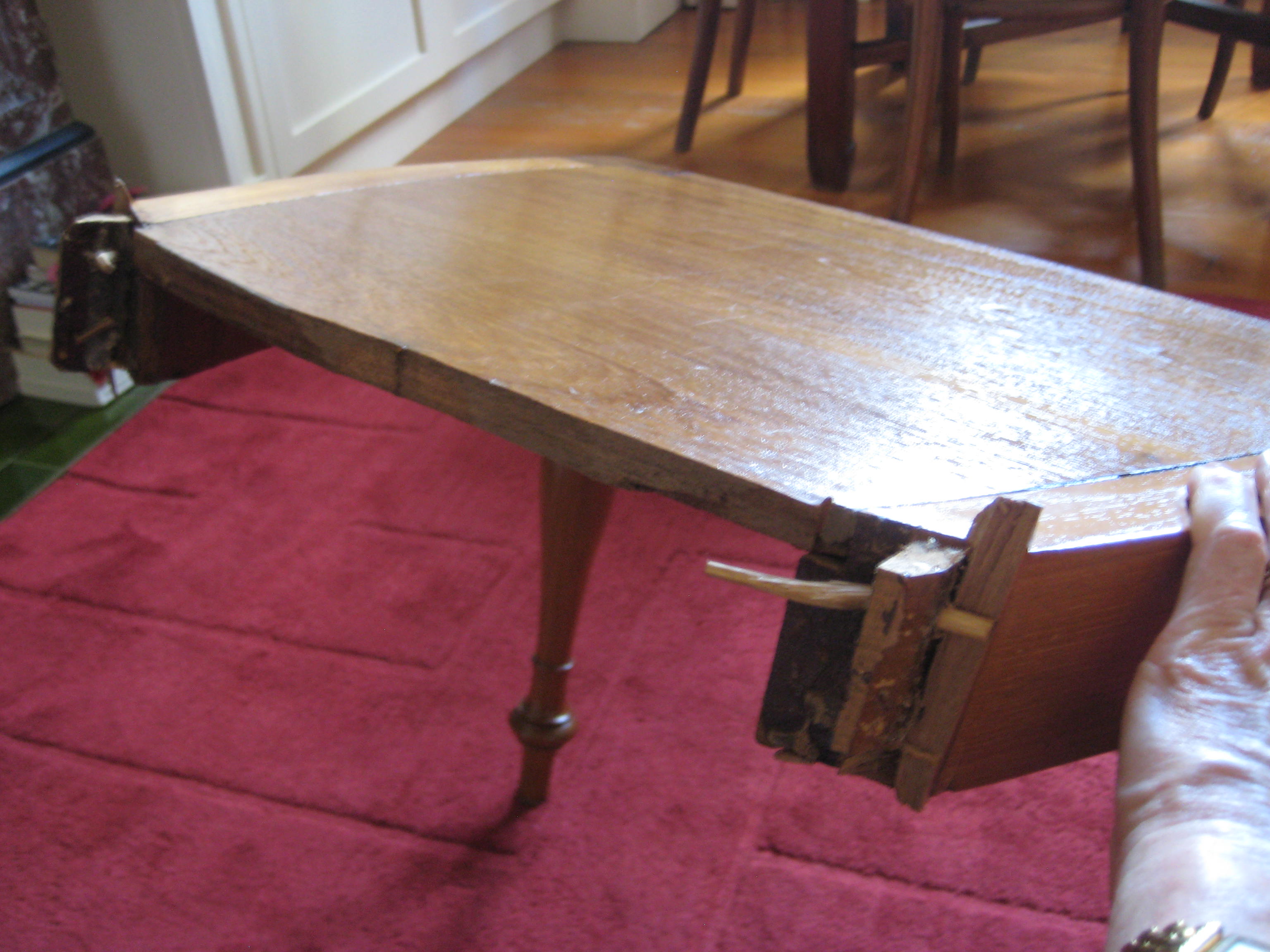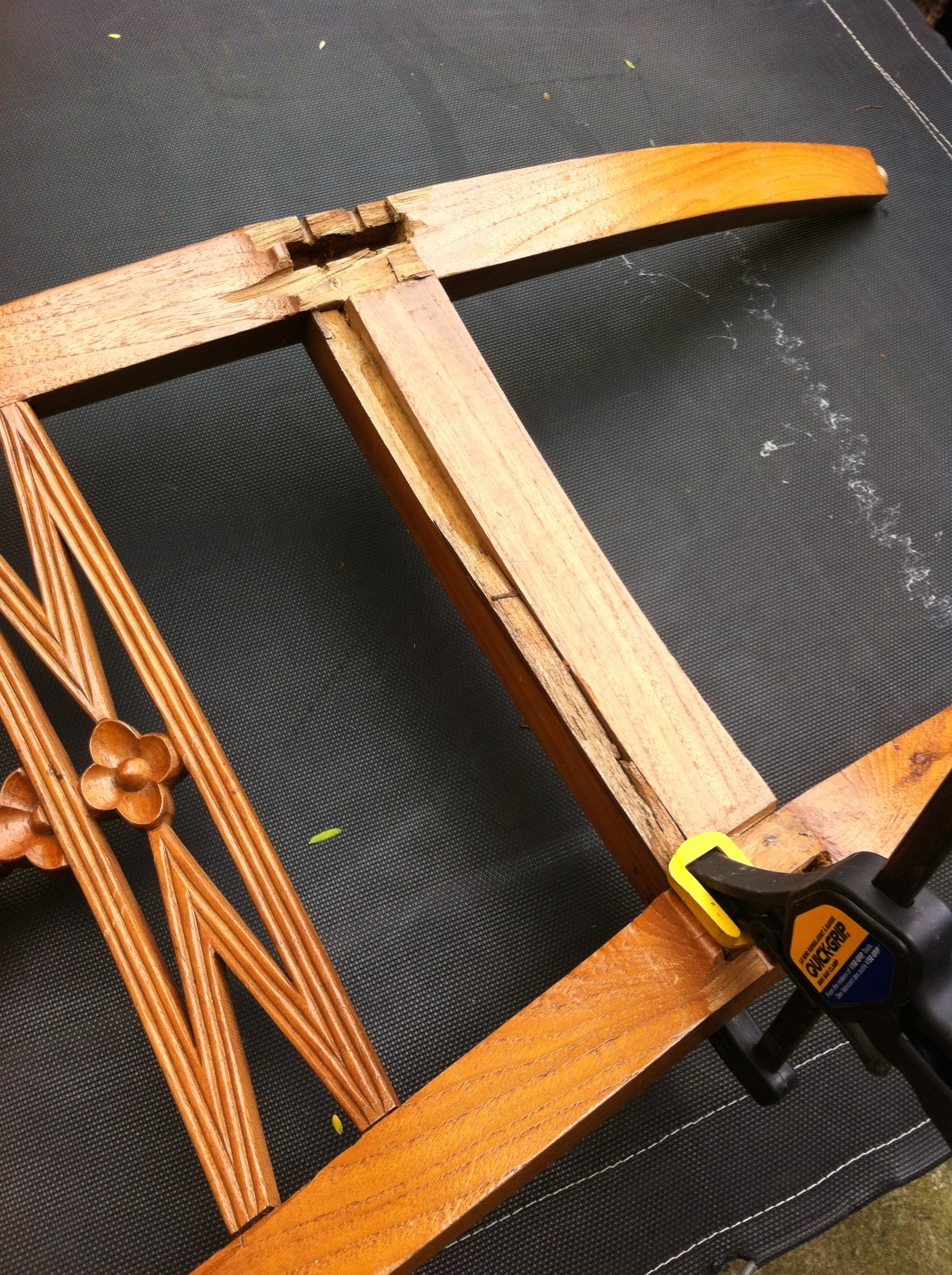 First off all the old glue needed to be sanded or scraped off so the new glue would adhere. In a number of areas the snap wood needed to be taken off so it would fit together again. All joints were glued and clamped together.